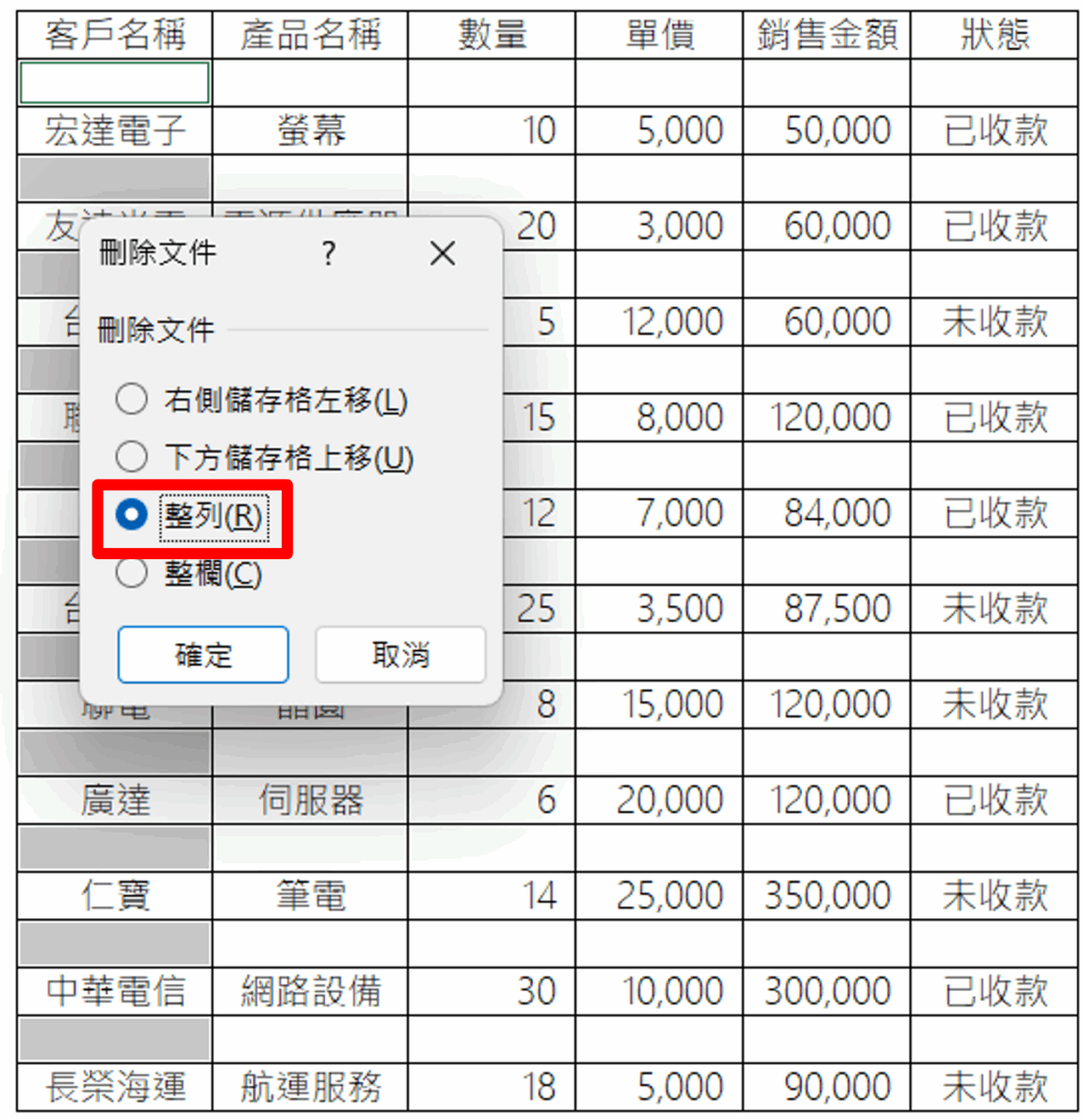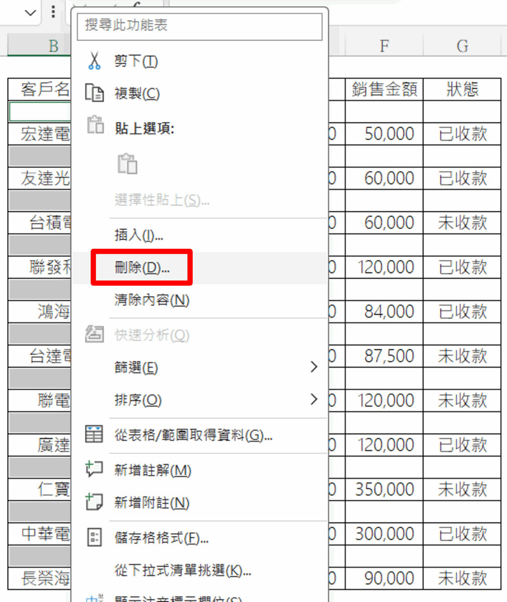③ 在被選取的空格中任選一格,按右鍵刪除「整列」,即可一次清掉空白列。(或是使用鍵盤快捷鍵 「 Ctrl + – 」。)