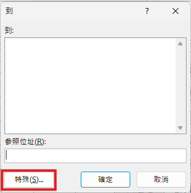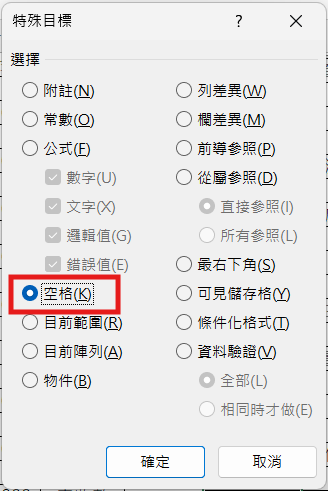 ② 按 Ctrl + G → 點「特殊」→ 選「空格」,空白儲存格會被一次選取起來。