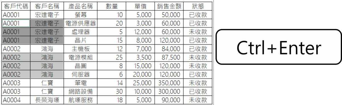 ④ 同時按下「 Ctrl + Enter 」,一次填滿所有空白儲存格,填滿的內容都是帶入上一格的資料