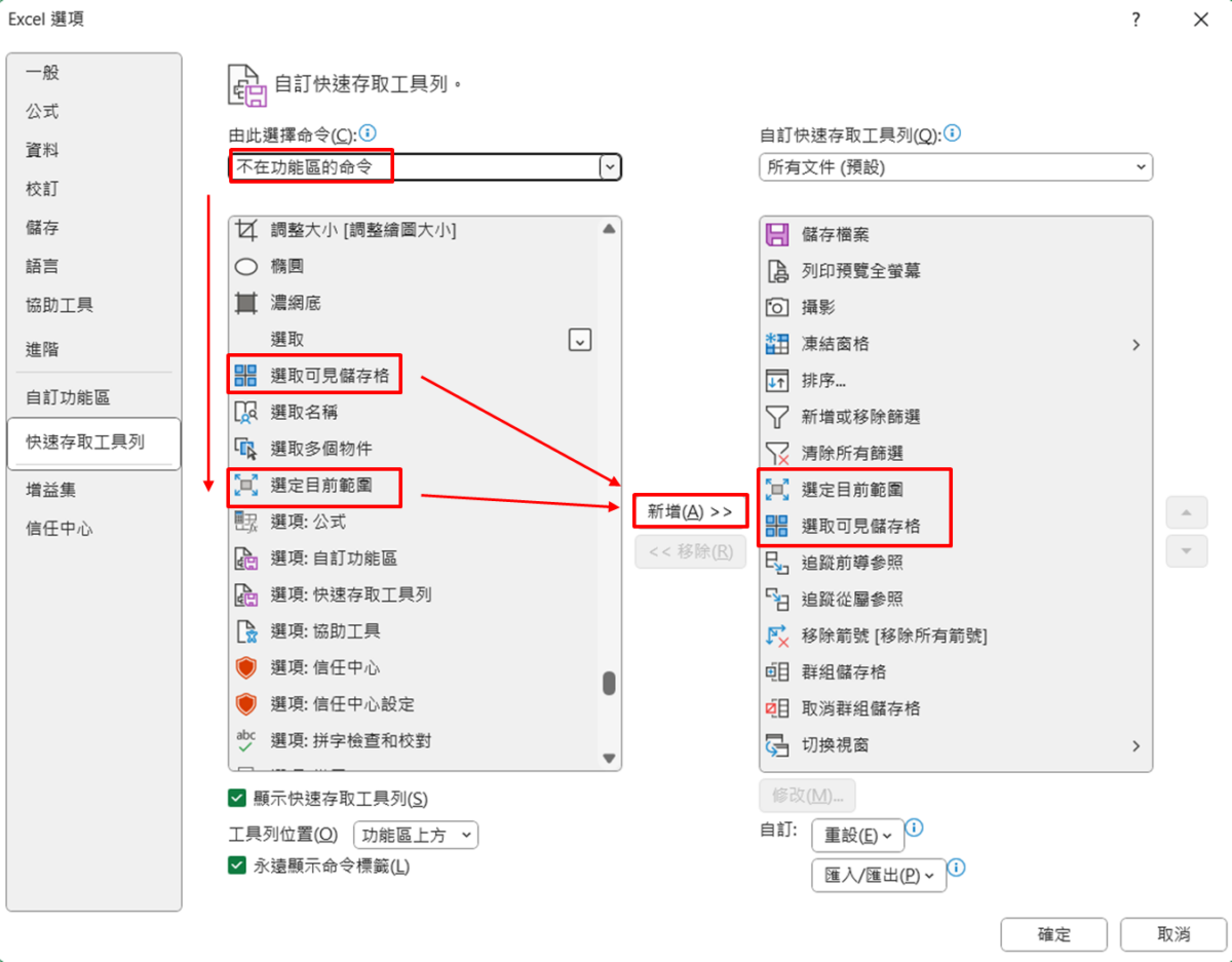 工具列下拉選項選擇「其他命令」,左側選擇「不在功能區的命令」,將「選定目前範圍」、「選取可見儲存格」加入快速存取工具列。